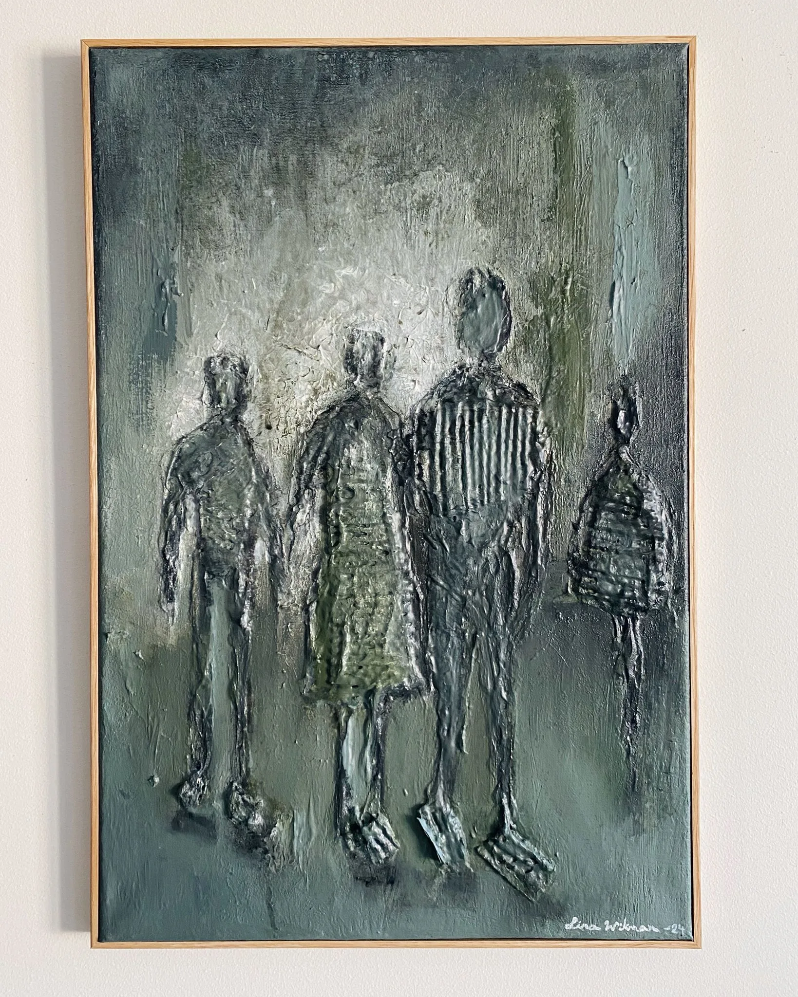 Jag målar mestadels i akryl på canvas, men jobbar även med akvarell och kol på mina tavlor. Jag gillar att blanda tekniker och texturer då resultatet blir mer spännande. En nyfunnen kärlek är keramiken där jag skulpterar olika former som skapar rörelse.